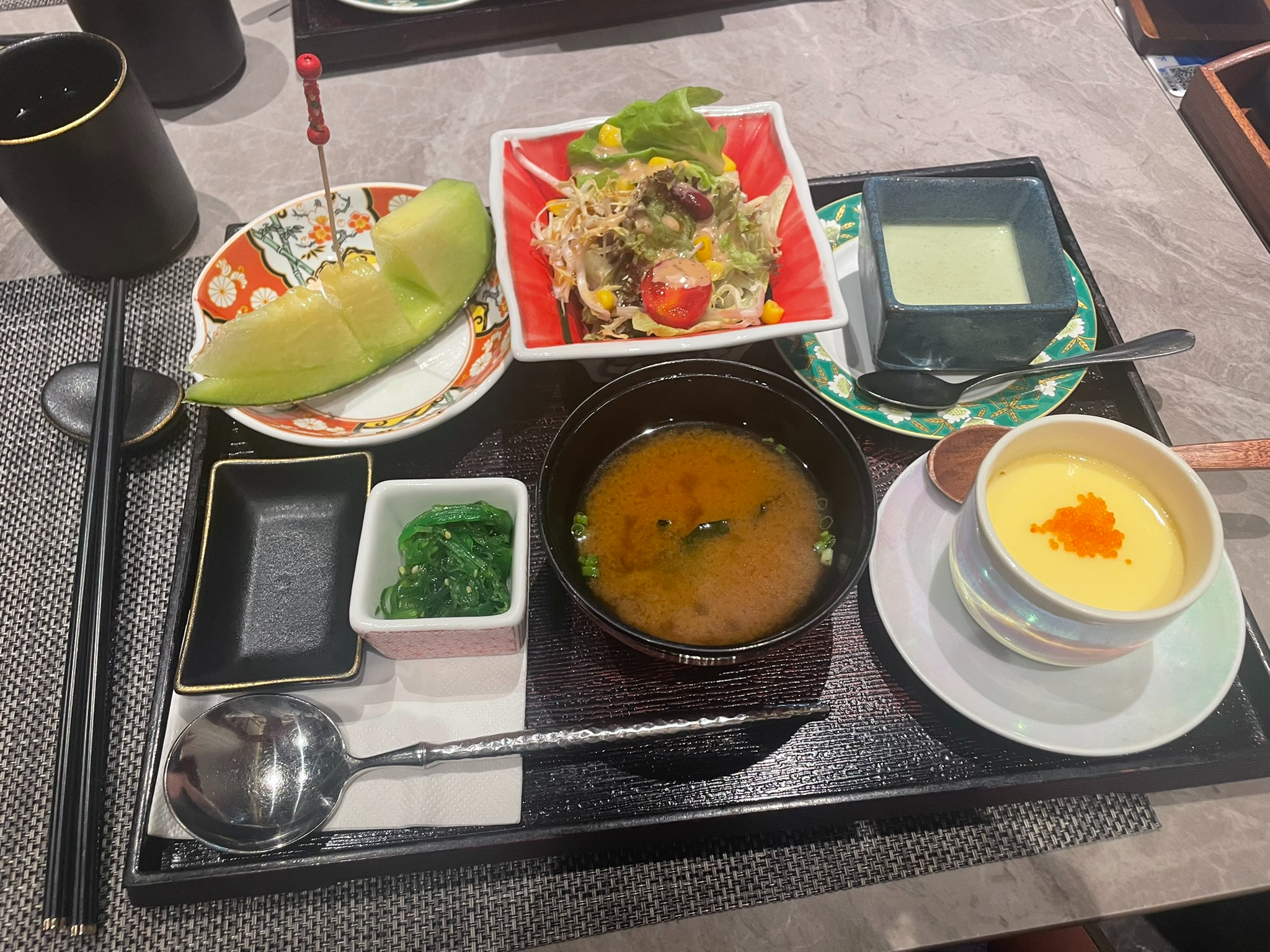assorted appetizers- the green stuff was like sweet matcha and the yellow stuff was egg